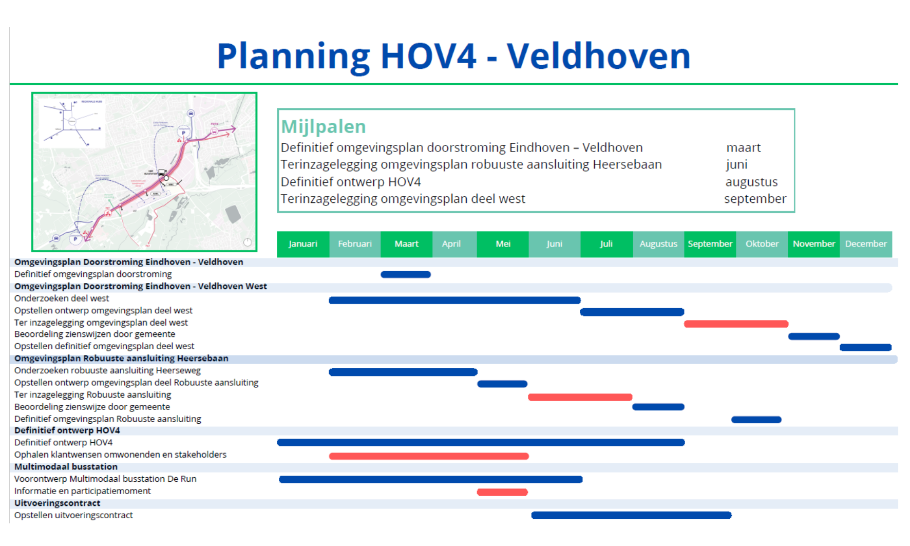 Dit is het omgevingsplan. De ter inzagelegging van het omgevingsplan HOV4 is voorbij. De ingediende zienswijzen worden nu beoordeeld en beantwoord. In maart 2026 bieden we het omgevingsplan Doorstroming Eindhoven – Veldhoven aan het college aan om vast te stellen. Het ontwerp van de HOV4 binnen gemeente Veldhoven bestaat uit 3 delen: west, midden en oost. Voor deel West (vanaf De Plank tot NH Koningshof) staan alleen de verbreding van het fietspad en de keerlus in het omgevingsplan Doorstroming Eindhoven – Veldhoven.